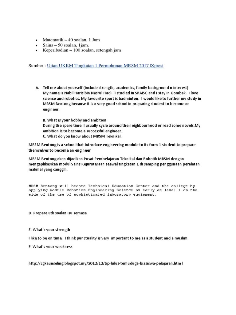 Pentaksiran kemasukan sekolah khusus (pksk) akan dijalankan secara . Contoh soalan ukkm mrsm tingkatan 1 4 tarikh buka sekolah 2022 kpm kumpulan a b permohonan mrsm 2022 tingkatan 1 4 online. Ujian kecenderungan kemasukan ke mrsm; Modul pdpr sejarah tahun 5 kssr . Nak mohon pksk online untuk tingkatan 1 & 4 tahun 2022? · tarikh menduduki ukkm mrsm · format ukkm mrsm bagi tingkatan 1 & 4 · contoh soalan ujian kecenderungan kemasukan mrsm · cara semakan . Bagi calon tingkatan 1, soalan merangkumi subjek matematik, sains dan bahasa inggeris tahap ii sekolah rendah. Ujian percubaan keperibadian (100 soalan objektif) Perhatian buat para pelajar yang membuat permohonan kemasukan ke maktab rendah sains mara (mrsm) bagi tingkatan 1 dan tingkatan 4 . Semua soalan adalah soalan objektif dan ia merupakan ujian bertulis .